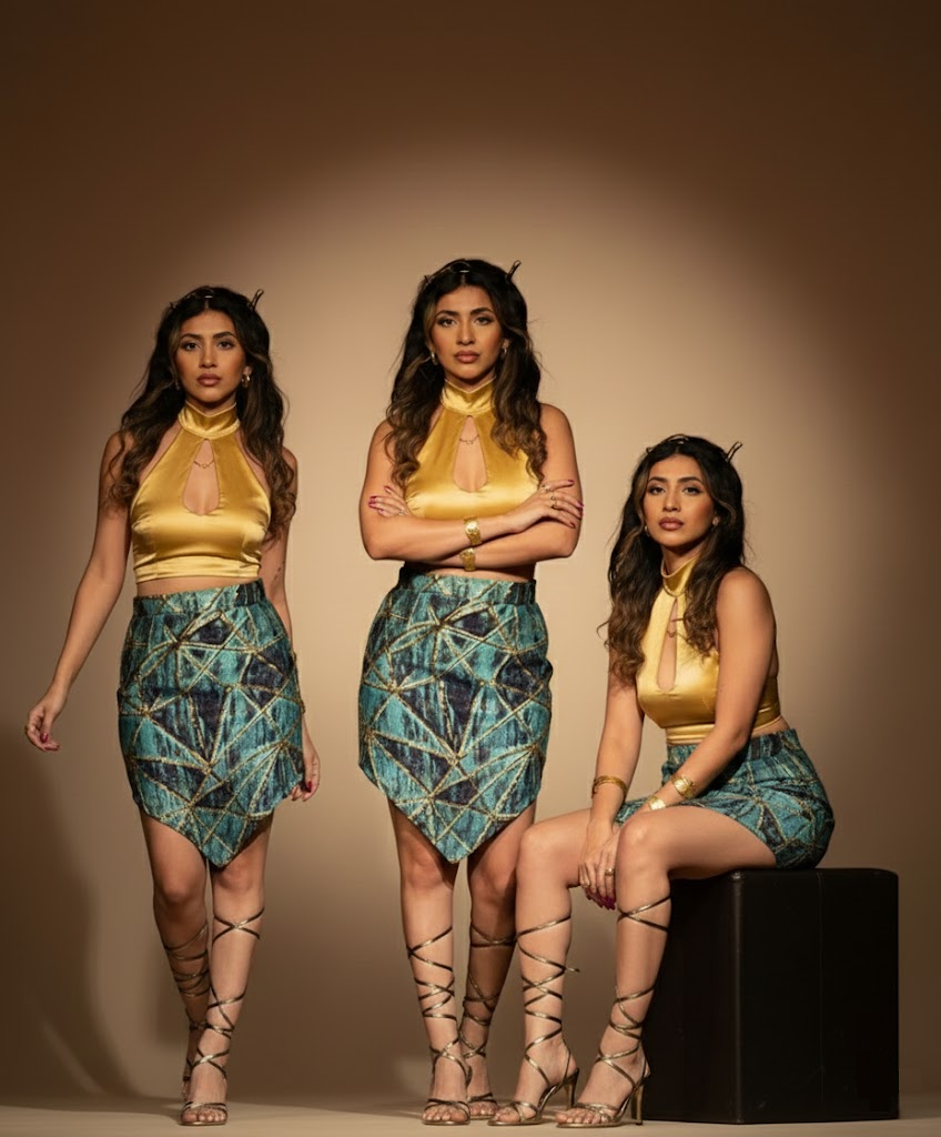 • The Hemline: The asymmetrical, pointed “v-cut” hemline is a clever nod to the draped kalasiris and the angularity found in ancient hieroglyphs and architectural reliefs. It adds a dynamic, edgy movement to the look.