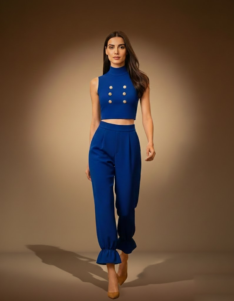 While the previous design drew inspiration from the golden sands of the Nile, this ensemble shifts the narrative toward a crisp, regal authority. This two-piece set reimagines classic military and nautical tailoring through a feminine, high-fashion lens, utilizing a striking “Cobalt Blue” that commands attention in any room.